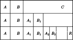 In order to prove the existence of the latter, we use a decomposition based upon the bijection g, illustrated by the following diagram, where \( B_{{i_{ + 1} }} \) is the image of B i in the given bijection g between \( A \cup B \cup C \) and C, and analogously \( A_{{i_{ + 1} }} \) is the image of A i ; a remainder R is possible: